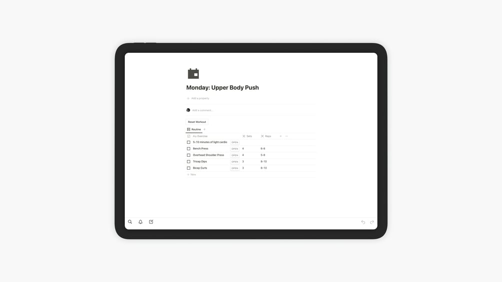 Automated Reset and Refresh: No more manual checkbox resetting. The template features an automated reset button that clears your completed exercises with a single click, leaving your routine ready for the next workout session. This streamlined process saves you time and maintains the simplicity of your routine management.